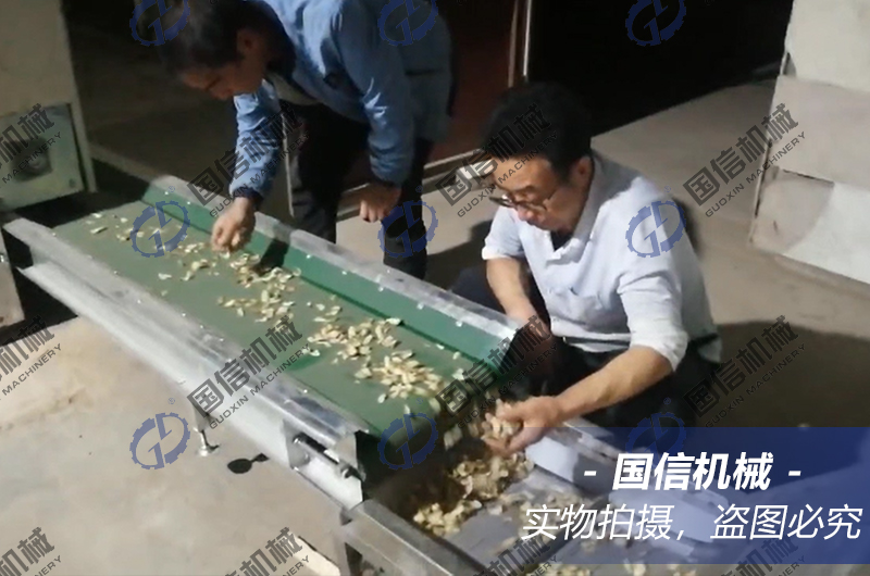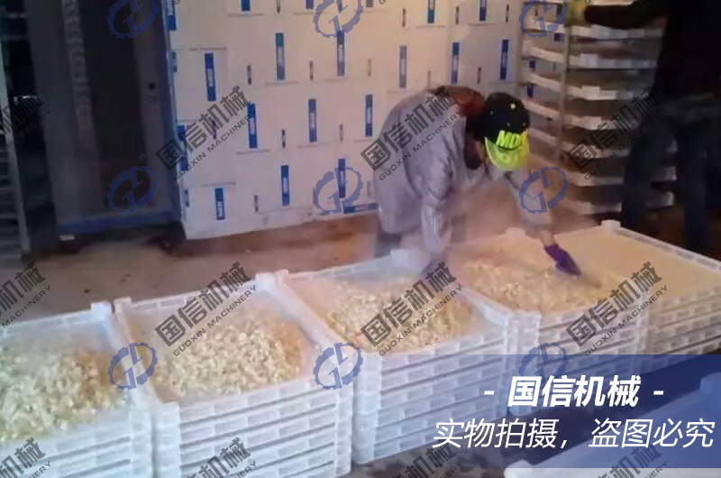 熱風(fēng)干燥:把瀝干表面水分的鱗片放入料斗內(nèi),經(jīng)自動(dòng)鋪料裝置送入百合烘干機(jī)*上層進(jìn)行干燥,溫度控制在60-70℃,在網(wǎng)帶的帶動(dòng)下,百合鱗片從上層往下層移動(dòng)。運(yùn)行中,百合片受到翻料器的翻動(dòng),同時(shí),百合鱗片有多次往下落的過(guò)程,使百合鱗片翻動(dòng)更徹底。*后,干燥至百合鱗片含水量至10%左右(手摸鱗片發(fā)脆為度),干燥好的百合干片從百合烘干機(jī)底層的出料口排出。
