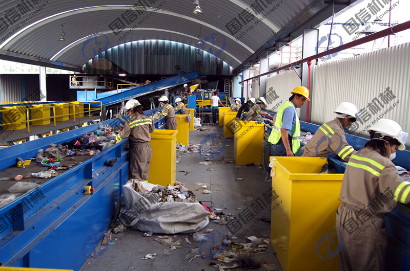 1、垃圾在進入垃圾處理廠后先卸在裝卸平臺上,之后由裝載機輸送至板式給料機中,垃圾經過皮帶輸送機輸送到人工分選平臺,這里由分選工人將垃圾中的大件垃圾和有危害性的廢物垃圾進行分揀出來。