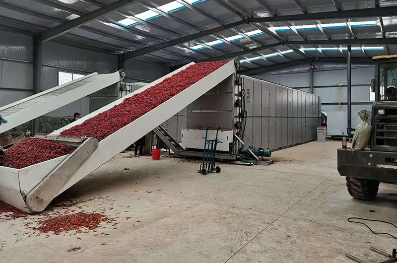 辣椒烘干機(jī)由4個(gè)部分組成,分別是上料輸送機(jī)、網(wǎng)帶式烘干機(jī)主機(jī)、熱源、出料輸送機(jī)。轉(zhuǎn)換爐提供熱量;網(wǎng)帶式穿流干燥機(jī)是干燥設(shè)備的主體,由機(jī)體和多層輸送帶組成;電控系統(tǒng)控制整個(gè)設(shè)備的啟動(dòng)、運(yùn)轉(zhuǎn)與停止。