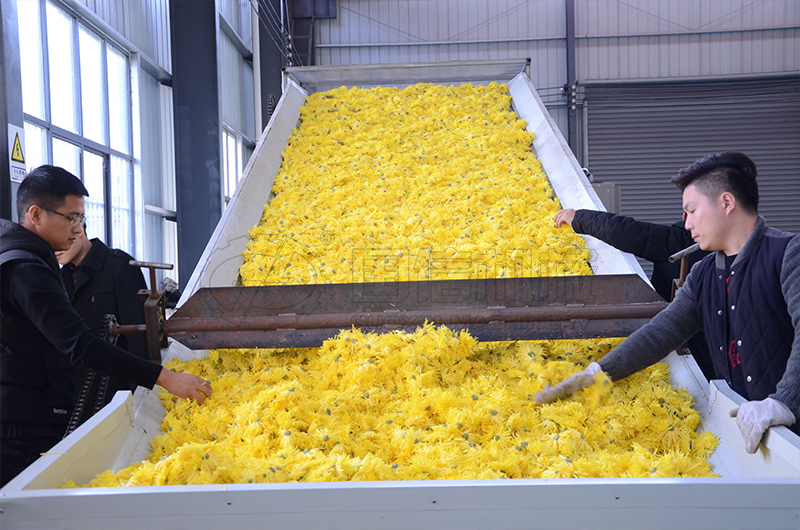 一次烘干的話,菊花外部花瓣可能會(huì)焦掉,而中心還是濕的,外焦內(nèi)濕,我們采取分兩步的方法,第一次溫度控制在40-50攝氏度之間,烘掉一部分的水分,然后堆放12小時(shí)以上,使花朵內(nèi)外水分均勻再進(jìn)行第二次烘干,第二次烘干的溫度控制在45-50攝氏度之間。