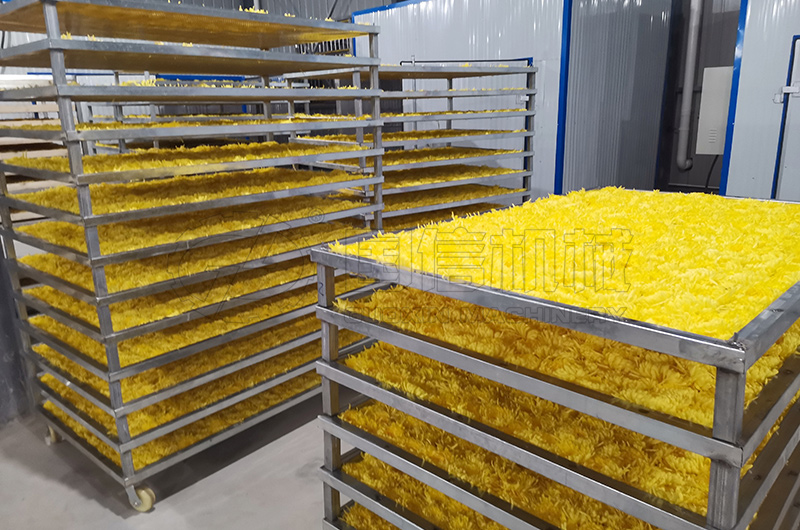 那么鮮菊花含水率我們按80%,要烘干到含水率12%,通過(guò)公式:干花重量=濕花重量×(1-烘干前含水率)/(1-烘干后含水率)可以計(jì)算出一百斤藥用菊花烘干后剩18斤左右,而鮮菊花5.7斤烘干后為一斤干菊花。