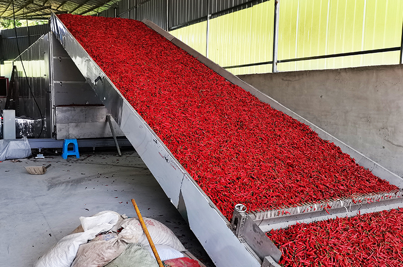 辣椒烘干機(jī)干燥辣椒需要設(shè)置合適的烘干溫度,溫度過(guò)高會(huì)破壞辣椒內(nèi)部的營(yíng)養(yǎng)成分,溫度過(guò)低會(huì)降低烘干效率。那么,辣椒烘干機(jī)溫度設(shè)置多少合適? 辣椒烘干機(jī)烘干辣椒過(guò)程 我們以國(guó)信機(jī)械生產(chǎn)的網(wǎng)帶式辣椒烘干機(jī)為例,先來(lái)了解一下辣椒烘干機(jī)烘干辣椒過(guò)程。 1、辣椒通過(guò)上料輸送機(jī)進(jìn)入烘干機(jī)主機(jī),通過(guò)勻料裝置將辣椒均勻鋪在網(wǎng)帶上。 2、辣椒在烘干室內(nèi)做“S”型運(yùn)動(dòng),逐層翻轉(zhuǎn)。 3、熱源提供熱風(fēng),通過(guò)引風(fēng)機(jī)進(jìn)入烘干機(jī)內(nèi),熱風(fēng)自下而上穿過(guò)網(wǎng)帶及辣椒層,逐層烘干辣椒。 4、烘干的辣椒由出料輸送機(jī)送出。 辣椒烘干機(jī)溫度設(shè)置多少合適? 辣椒的含水率在75%-85%之間,在烘干辣椒時(shí),為了保證烘干效果,溫度應(yīng)該設(shè)定在40°C-60°C之間,這個(gè)區(qū)間烘干出的辣椒,品質(zhì)比較好,顏色和營(yíng)養(yǎng)價(jià)值都不會(huì)發(fā)生太大變化。 當(dāng)然,干燥過(guò)程中,還可根據(jù)生產(chǎn)需要對(duì)網(wǎng)帶運(yùn)行速度、溫度和濕度進(jìn)行調(diào)節(jié),以便對(duì)不同含水率、不同品種的辣椒進(jìn)行烘干處理。