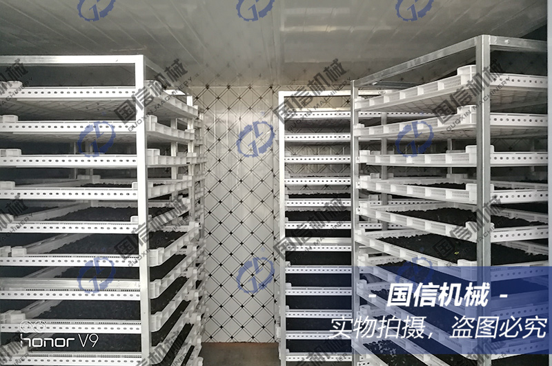 桑葚是高糖分、高水分含量的漿果,較長果形是由一個一個小果囊的形狀組成,水分難以出來,所以需要較長的時間。同時烘干溫度又不能太高,溫度太高,就容易影響花青素的有效含量。烘干第一階段溫升一小時,不排濕,烘干模式,讓烘干房上升至50度左右。第二階段設(shè)為烘干+排濕模式,目標(biāo)濕度為60%,目標(biāo)溫度設(shè)為55度。第三、第四階段每一階段上升5度,目標(biāo)濕度下降10%,讓烘干房不斷排濕。最終一個階段目標(biāo)濕度設(shè)為15%左右。如果條件許可,可以考慮在第四階段末了,停機靜置一段時間再復(fù)烘,這樣果干內(nèi)部的水份滲出后被復(fù)烘的熱量加熱揮發(fā),果干果形更好,同時總體能效更好。