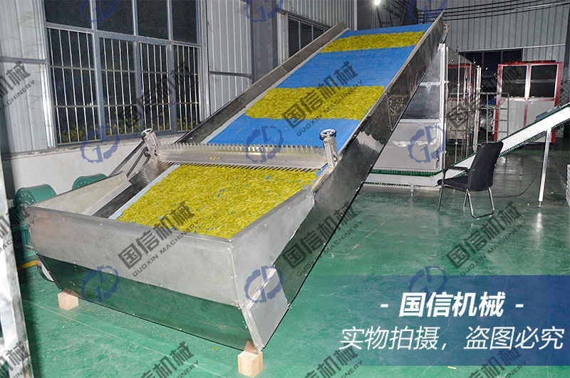 采摘的花應(yīng)及時加工處理。首先大火熱蒸,使酶類受熱變性,抑制其活性;如放置過久,遇適宜的溫度花蕾會在酶的作用下轉(zhuǎn)化養(yǎng)分而逐漸開放, 則影響干制品質(zhì)。熱蒸處理是黃花菜干制的關(guān)鍵環(huán)節(jié)。 熱蒸前應(yīng)對原料進(jìn)行挑選,除去雜質(zhì),挑揀出已開放的花。 將挑選好的花放置籠屜上,先用大火將水燒開,然后迅速上籠, 待冒出蒸氣后改用文火再蒸10分鐘左右即可出籠。 熱蒸時籠屜應(yīng)離開水面一定距離,因距離太近, 沸水接觸到的花蕾即會裂嘴散開,就喪失了干制價值。 熱蒸程度一般掌握在花蕾“里生外熟”約五成熟即可, 人工干燥比自然干燥可稍生一些。要求出籠的花蕾黃亮,呈淡黃色而不發(fā)綠,花蕾上布滿小水珠。出籠后堆放厚度比鮮菜堆放時減少1/3,手捏略帶綿軟而又有韌性,用筷子夾起花蕾中部時,兩端稍向下彎曲。熱蒸后稍生的黃花, 迅速揀出單獨(dú)放置在容器內(nèi)蒙嚴(yán),用余熱使其達(dá)到要求;如果還仍欠熟,可挑揀出再蒸。 蒸好后可放置在通風(fēng)蔭涼處自然冷卻, 如果有條件可將離鍋籠屜不倒騰黃花冷卻,冷卻和晾花時間約4小時即可轉(zhuǎn)入烘曬。