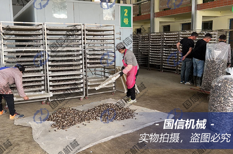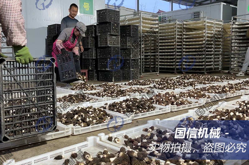 羊肚菌水分含量非常高,在烘干過中要特別注重溫度與濕度的控制。而且不同批次采收的羊肚菌其水分含量不一樣。一般來說,第一茬菇的含水量相對(duì)低,陸續(xù)第二茬菇、第三茬菇的含水量一批批加大,都可以在第一茬菇烘干經(jīng)驗(yàn)的基礎(chǔ)上適當(dāng)加長時(shí)間。這里以第一茬菇的烘干為例,介紹羊肚菌的烘干經(jīng)驗(yàn):